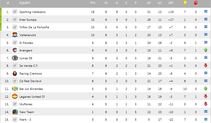 LES OFRECEMOS LA CLASIFICACION OFICIAL DEL CAMPEONATO CON EL INTER EUROPA COLIDER A LA ESPERA DEL ENFRENTAMIENTO DIRECTO QUE TENDRA LUGAR LA PROXIMA JORNADA ENTRE LOS DOS EQUIPOS QUE ESTAN AL FRENTE DE LA MISMA